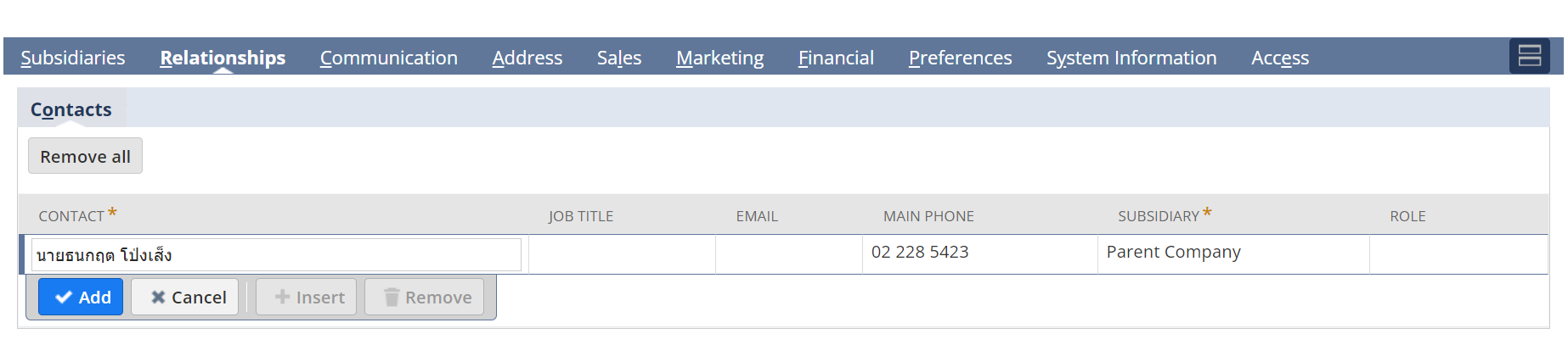 1 | Contacts | ระบุชื่อผู้ติดต่อ | No |