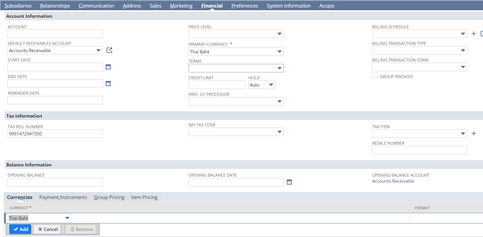 การสร้างลูกค้ารายใหม่เป็นการเพิ่มข้อมูลลูกค้าเข้าสู่ระบบ เพื่อใช้ในกระบวนการขาย การออกใบแจ้งหนี้ และการติดตามสถานะลูกค้า ข้อมูลที่จำเป็นจะรวมถึงชื่อที่อยู่ ข้อมูลการติดต่อ และเงื่อนไขการชำระเงิน เป็นต้น ระบบจะบันทึกข้อมูลเหล่านี้เพื่อฝ่ายขายและฝ่ายการเงินใช้ในการดำเนินธุรกิจอย่างมีประสิทธิภาพ