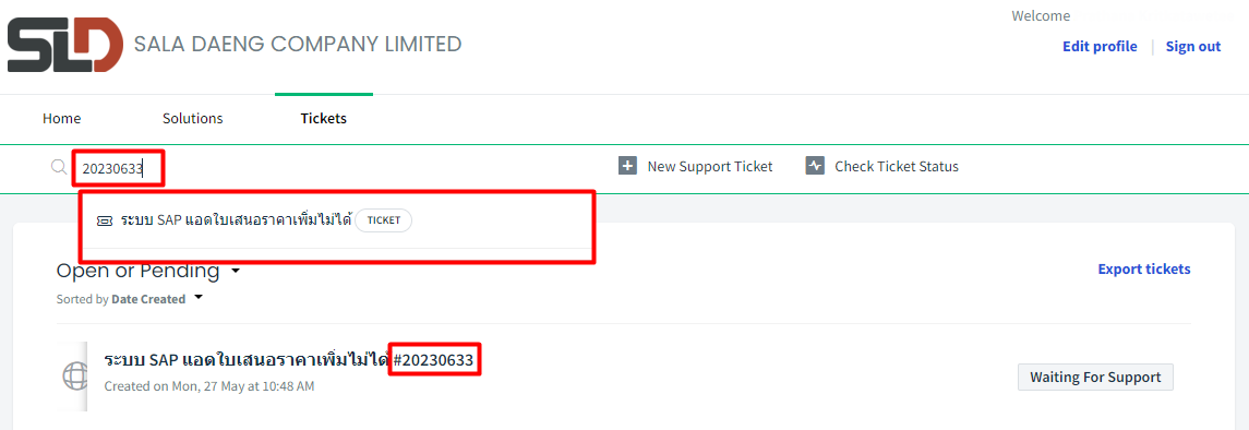 ช่องทางการค้นหา หากผู้ใช้งานทราบหมายเลขคำร้อง (Ticket) ที่ต้องการค้นหา หรือต้องการค้นหาจากชื่อหัวข้อ (Subject) ของ Ticket นั้นๆ สามารถใช้งานช่องค้นหาตรงนี้