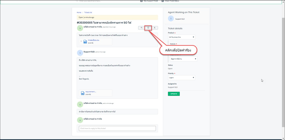 เมื่อผู้ใช้งานมีการตอบกลับ Ticket สถานะของคำร้องจะถูกเปลี่ยนเป็น Open