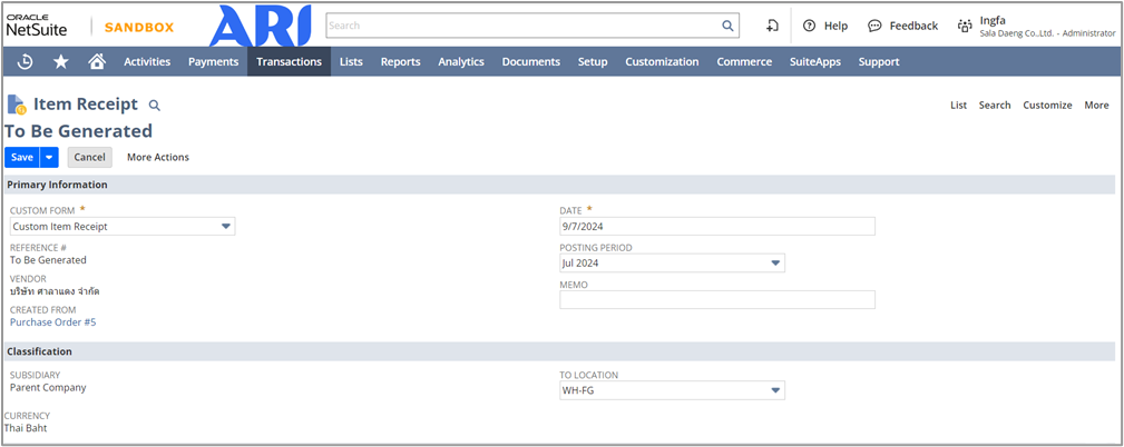 6 | To Location | ระบุคลังสินค้าที่ต้องการรับเข้าระบบ | Yes |