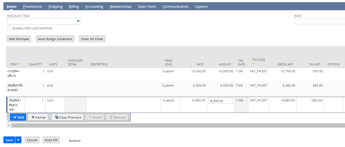 1 | Item | เลือกใช้ Item เงินมัดจำรับล่วงหน้า (ค่าบวก) | Yes |