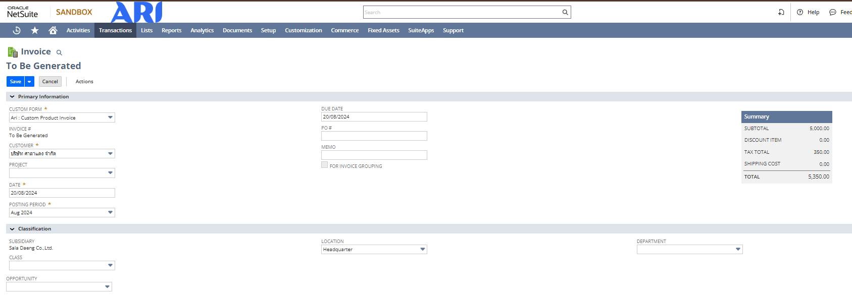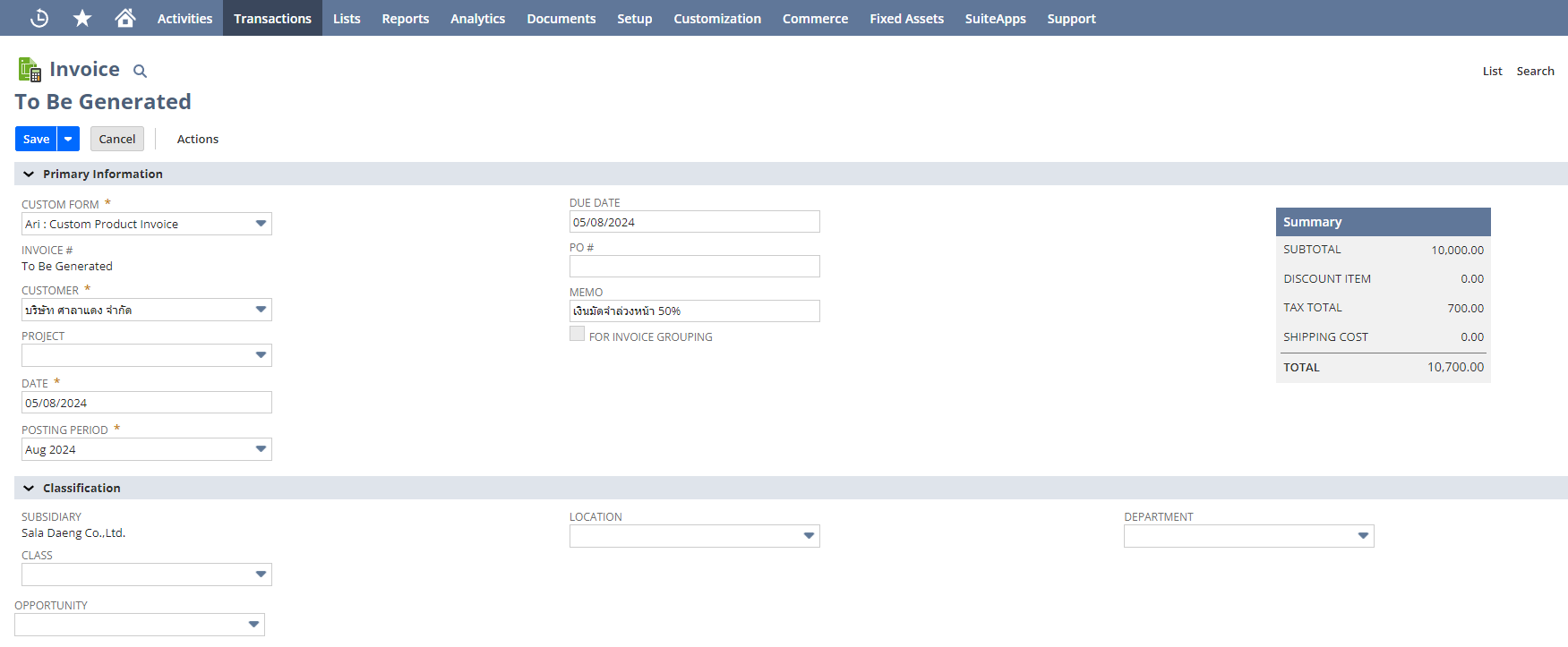 13 | Save | กดปุ่ม Save เพื่อบันทึกใบแจ้งหนี้ | Yes |