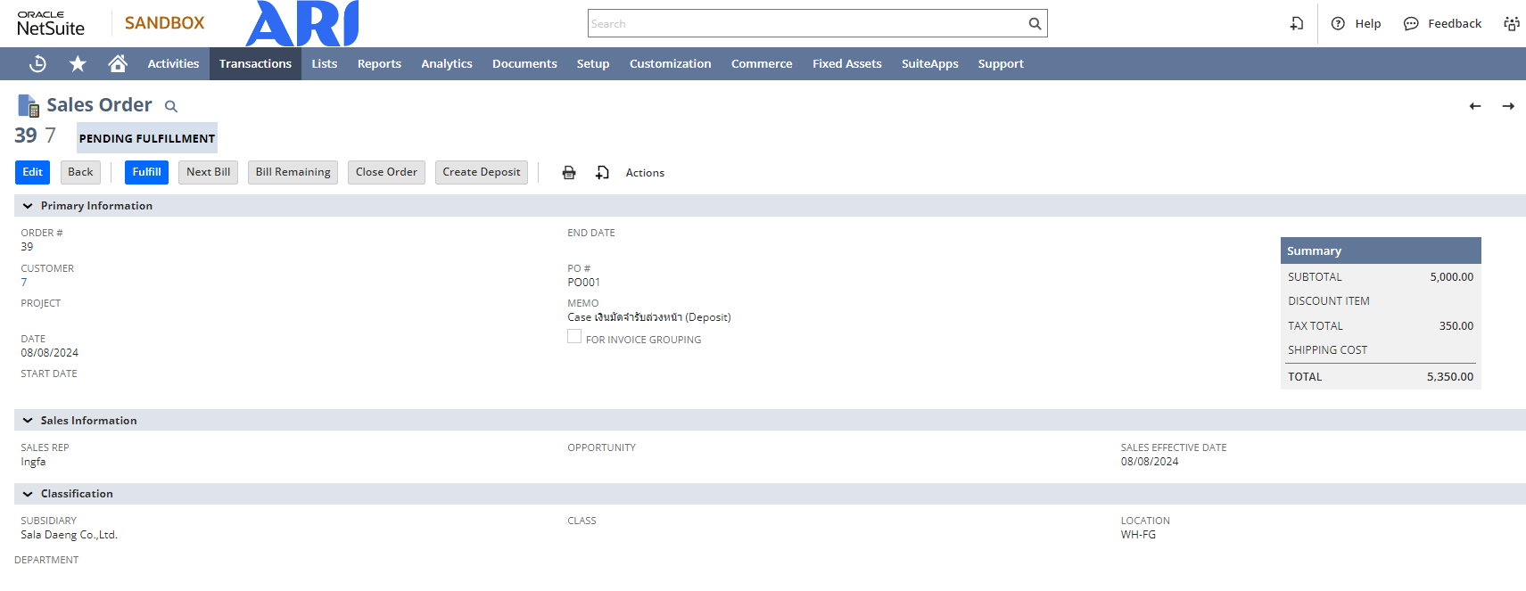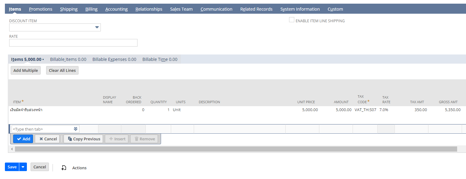 - Sales Order การสร้างใบสั่งขายเพื่อรับเงินมัดจำล่วงหน้าโดยใช้ Item Deposit