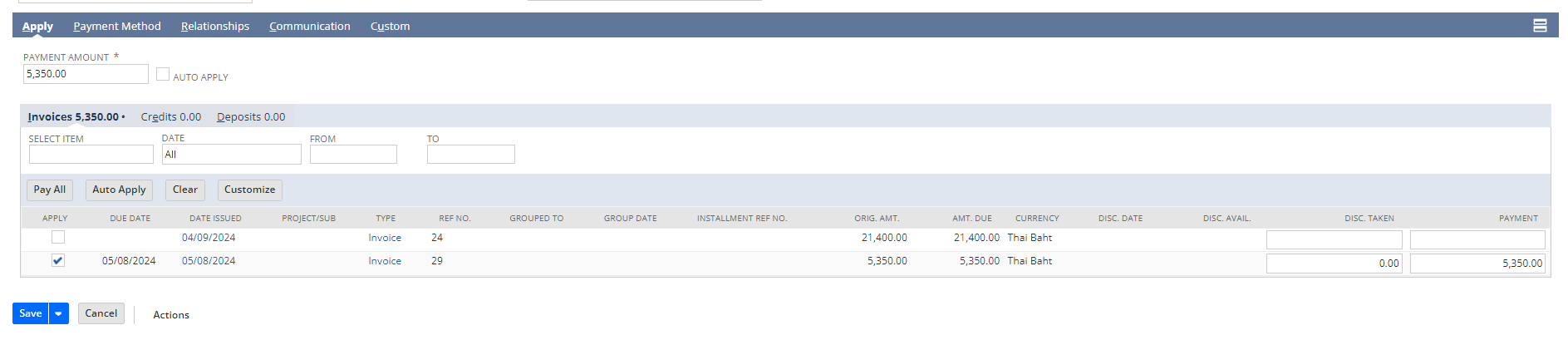1 | Apply | เลือกบแจ้งหนี้ที่ต้องการรับชำระเงิน | Yes |