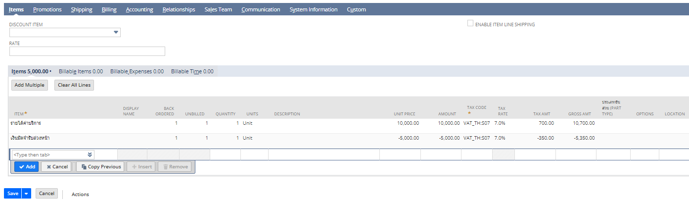 2 | Item Service ( Line 2 ) | ระบุ Item เงินมัดจำรับล่วงหน้า (ค่าบวก) | Yes |