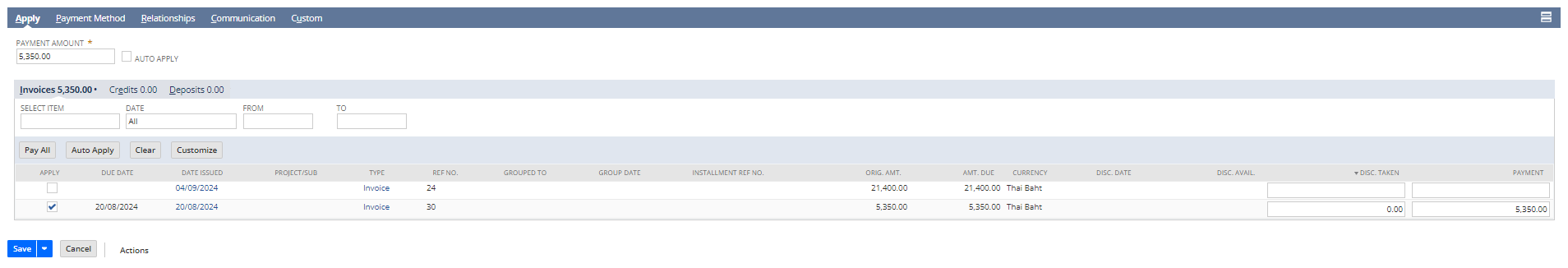 Accept Customer Payment - การรับชำระค่าเงินบริการ (หลังหักเงินมัดรับจำล่วงหน้า)