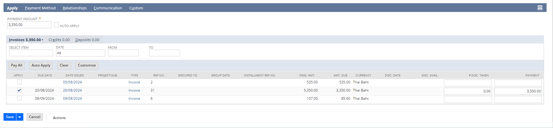 Menu Path : Deposit Application จะแสดงในหน้า Invoice > แถบ Related Record > Type : Deposit Application