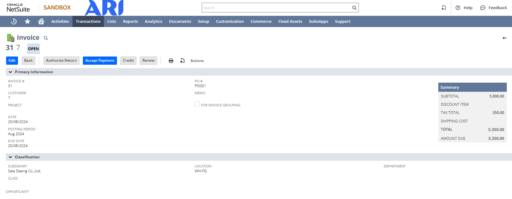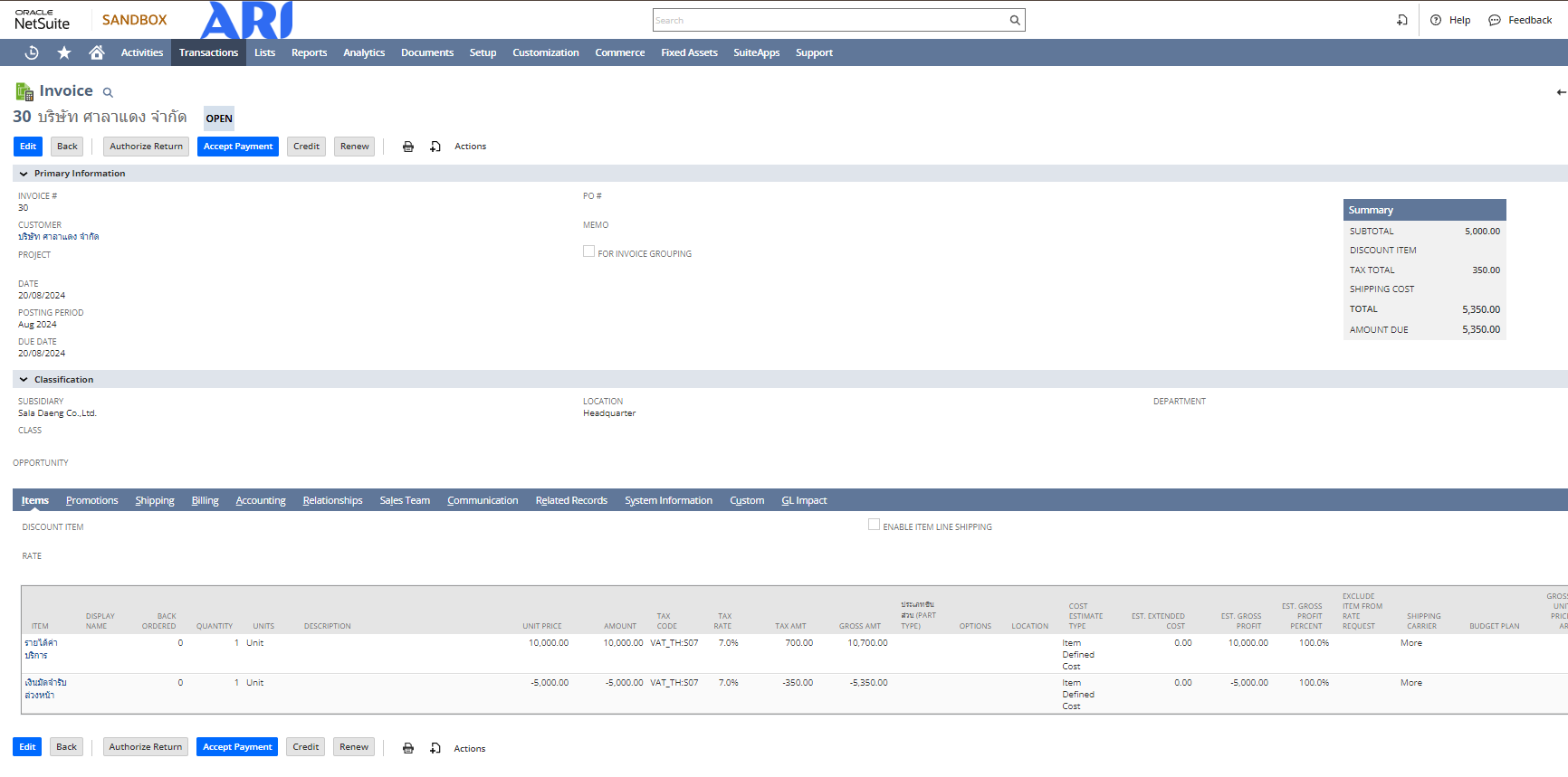 - Create Invoice - การออกใบแจ้งหนี้ค่าสินค้า/บริการ (หลังรับเงินมัดจำล่วงหน้า)