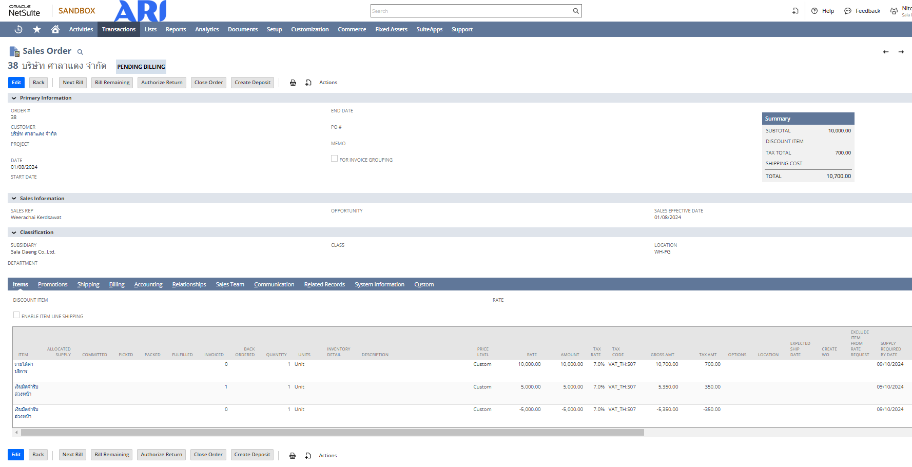 Menu Path : จากหน้า Sales Order กดปุ่ม Next Bill เพื่อตั้งหนี้ค่าบริการ