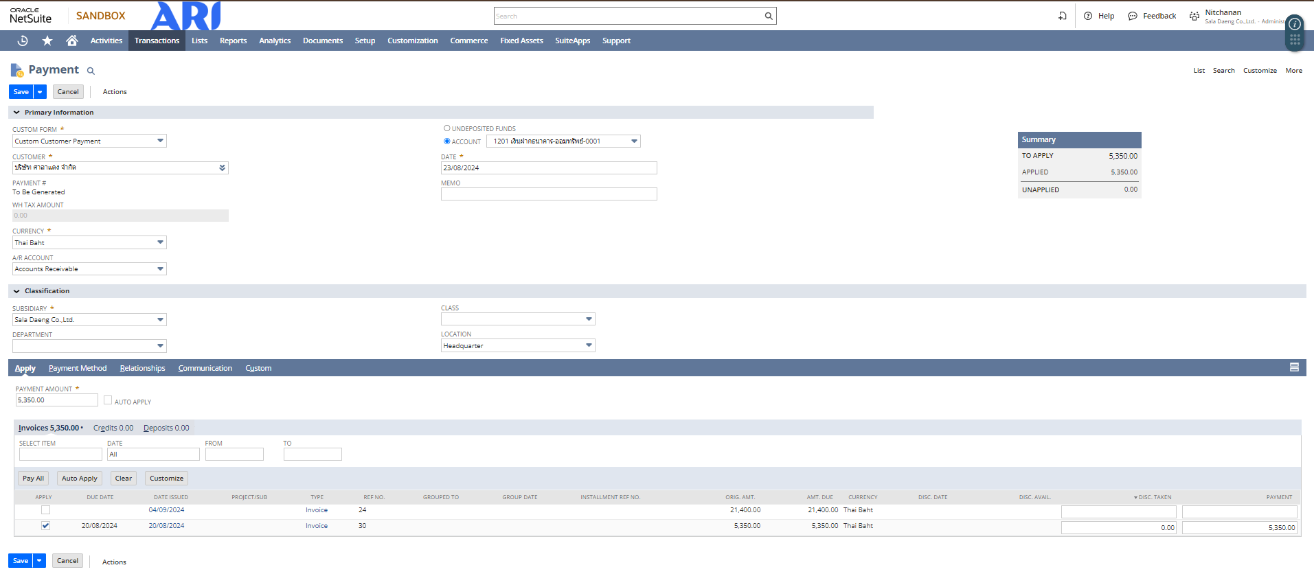 Customer Payment - รับชำระค่าสินค้า (หักเงินมัดจำรับล่วงหน้า)
