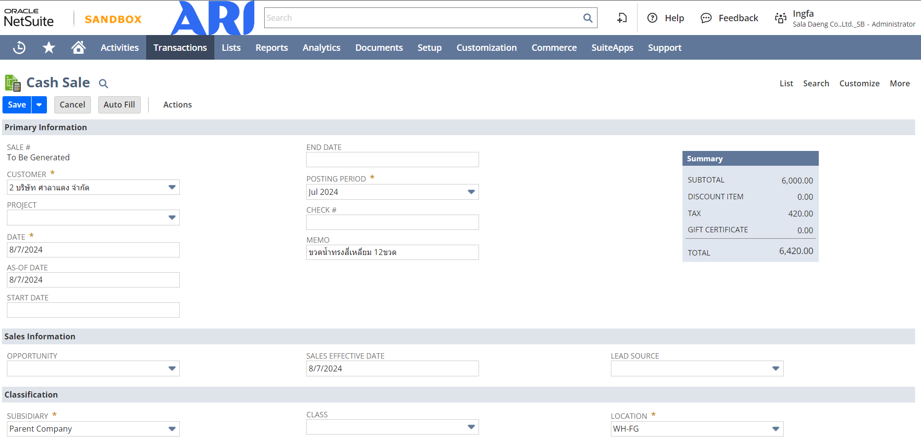 Cash Sales คือ การบันทึกการขายสินค้าหรือบริการที่ลูกค้าชำระเงินทันทีในรูปแบบเงินสด โดยรวมถึงรายละเอียดเช่น รายการสินค้า, จำนวน, และราคาที่ลูกค้าได้ชำระ การบันทึกใบขายเงินสดนี้ช่วยให้สามารถติดตามยอดขายและรายรับเงินสดได้อย่างมีประสิทธิภาพ พร้อมทั้งอัปเดตข้อมูลสต็อกสินค้าในระบบ