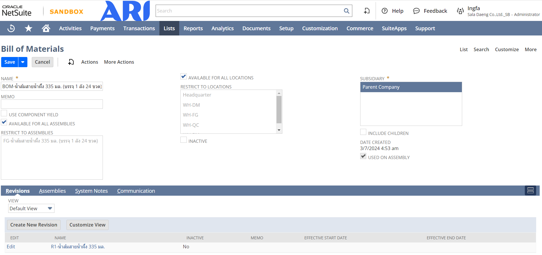 3 | Available For All Assemblies | ติ๊กเลือกสำหรับให้ใช้สูตรการผลิตนี้สำหรับ Item Assemblies ทุกตัว | No |