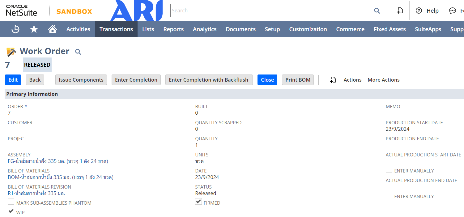 Enter Completion คือ กระบวนการรับสินค้าจากการผลิตหรือการประกอบสินค้าที่เสร็จสมบูรณ์ตามใบสั่งงาน (Work Order)