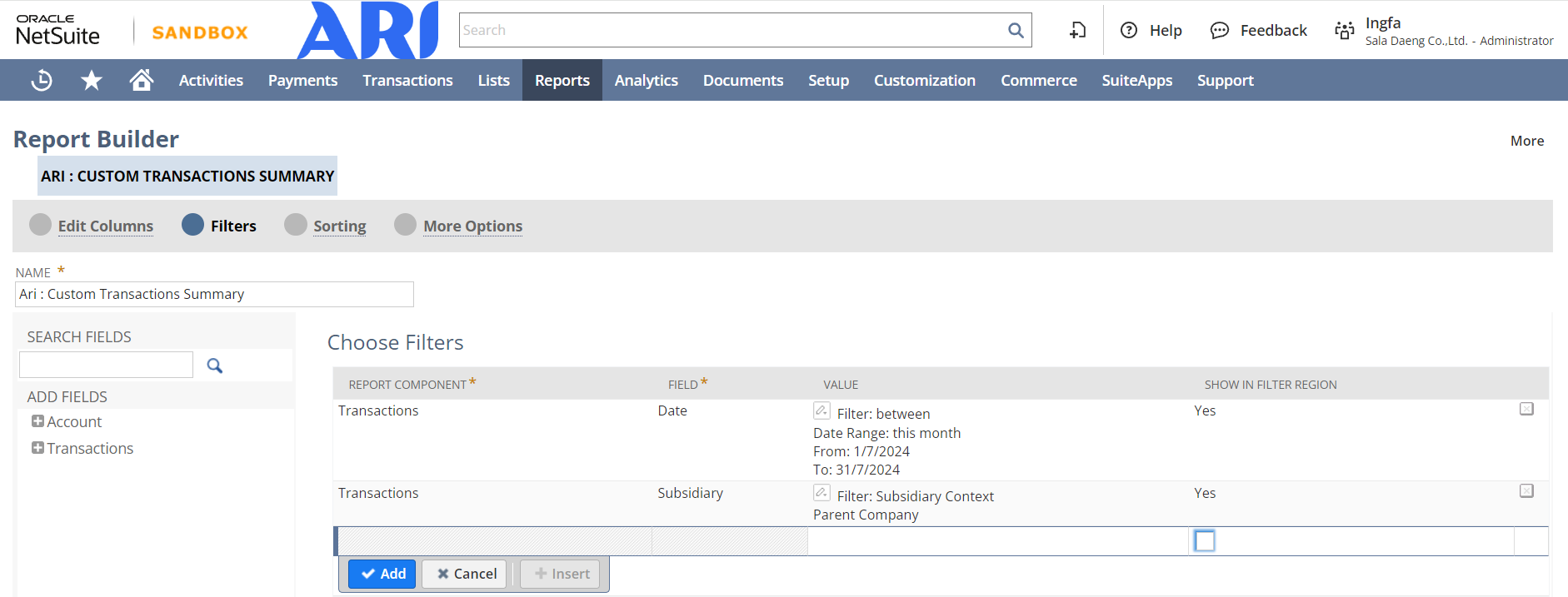 1 | เลือก Report ที่ต้องการสร้าง | เลือก Transaction หากต้องการสร้าง Report ที่เกี่ยวกับเอกสาร | Yes |