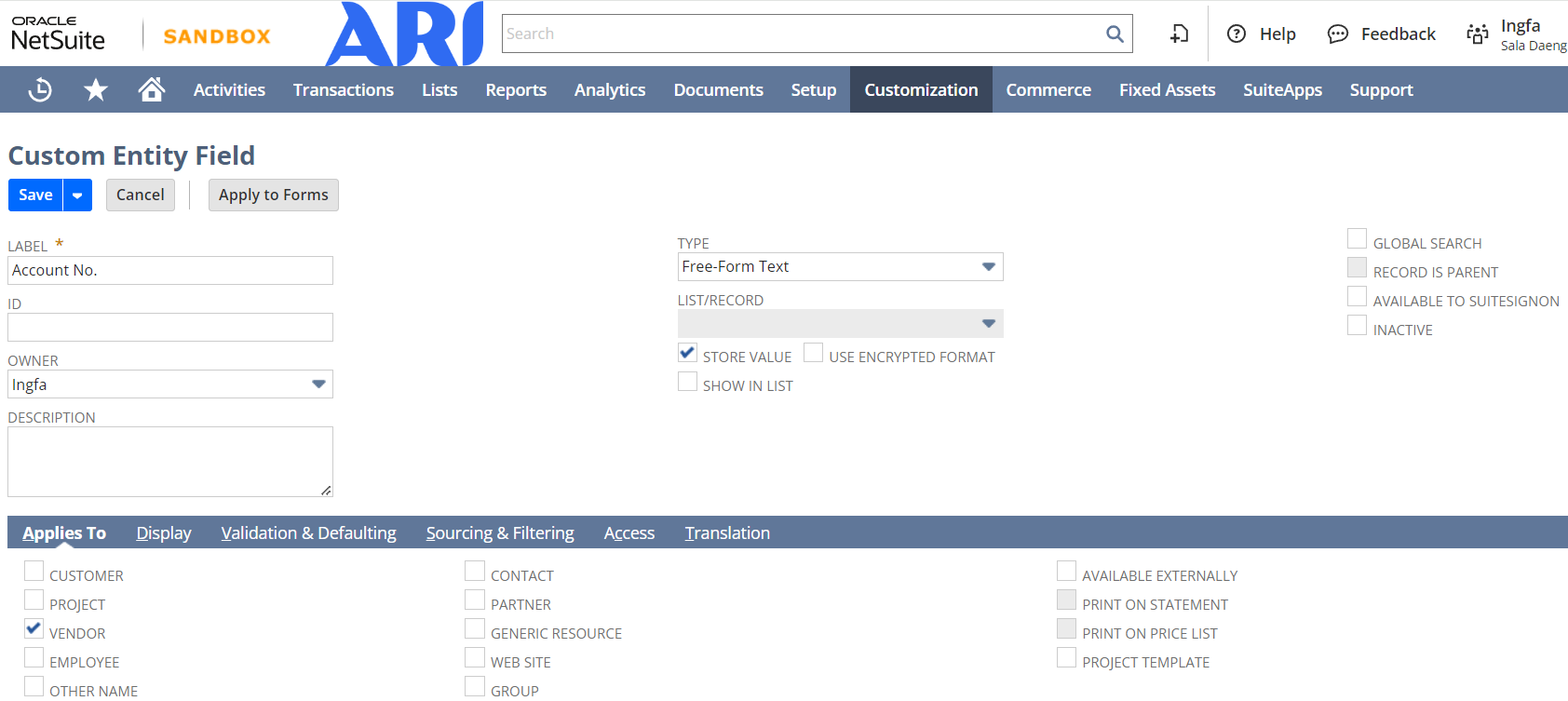 4 | Applies To | ระบุหน้า Transactions ที่ต้องการให้ฟิลด์ที่สร้างไปแสดง | No |