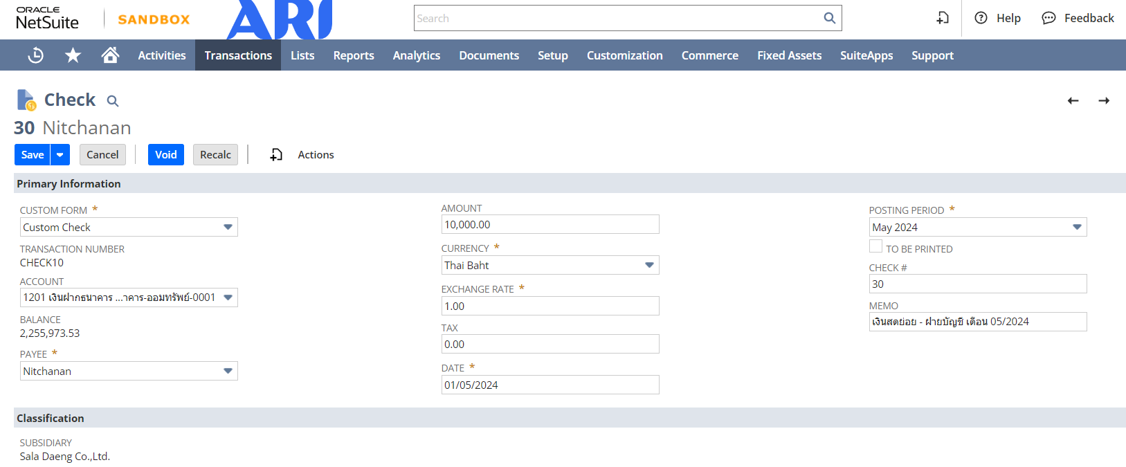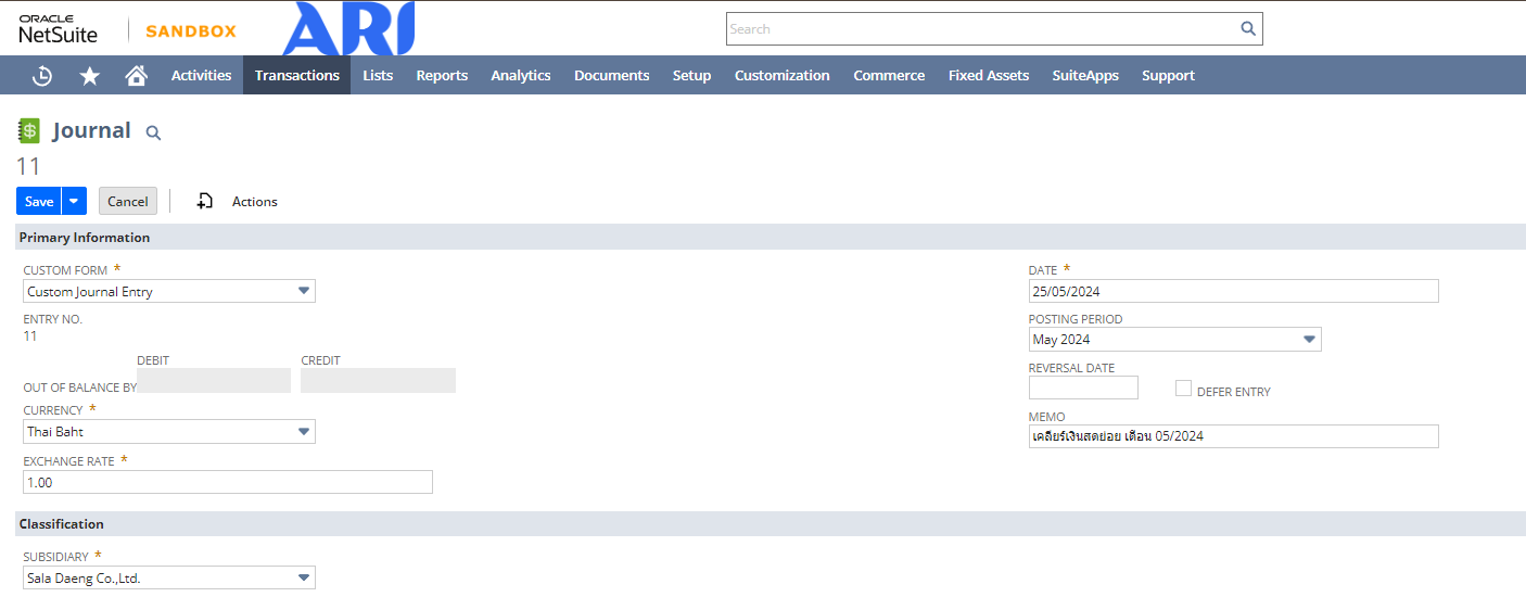 1 | Transaction Number | ระบบสร้างเลขที่เอกสารหลังจากกด Save | Yes |