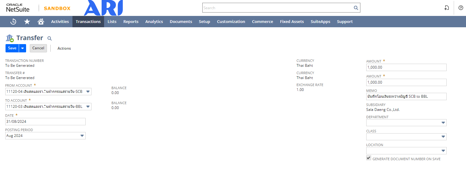 1 | Transaction Number | ระบบสร้างเลขที่เอกสารหลังจากกด Save | Yes |
