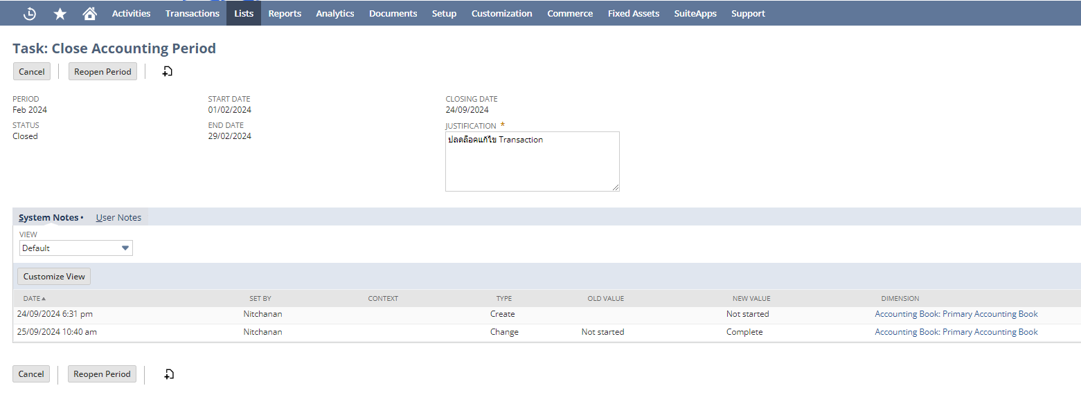 ผู้ใช้งานจะต้องเปิดงวดบัญชี (Reopen) นั้นอีกครั้ง ซึ่งจะต้องใส่เหตุผลและคำอธิบายในช่อง Justification และคลิกที่ปุ่ม Reopen Period เพื่อเปิดงวดบัญชี