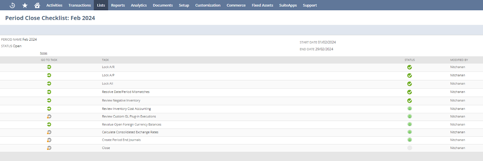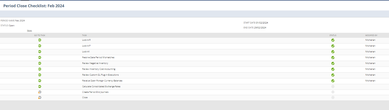 Menu Path : จากหน้า Manage Accounting Periods คลิกไอคอน ?ที่ Column Checklist ของงวดบัญชีที่ต้องการล็อคหรือปลดล็อคงวดบัญชี ซึ่งลำดับการล็อคจะต้องเรียงตามหน้า Checklist ดังนี้