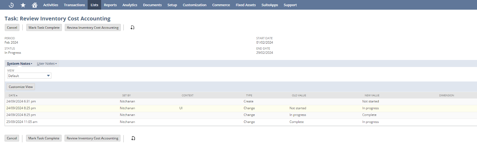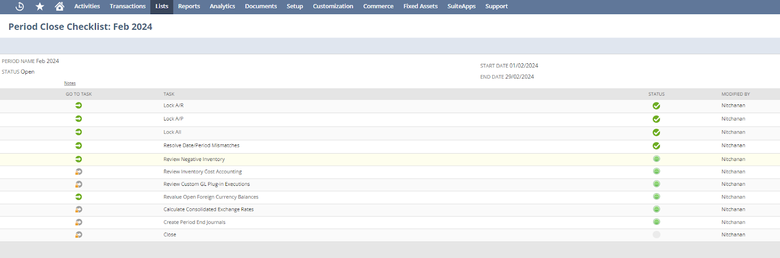 แก้ไขวันที่/ช่วงเวลาที่ไม่ตรงกันสินค้าคงคลังทั้งหมดถูกบันทึกในช่วงเวลาการบัญชีที่ถูกต้อง ซึ่งอาจต้องมีการปรับปรุงหรือลงรายการใหม่หากพบปัญหา โดยคลิกไอคอน Go to Task